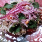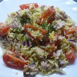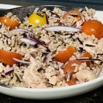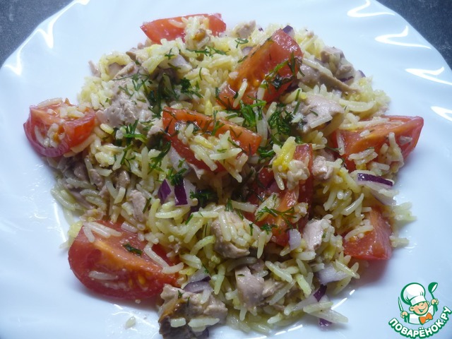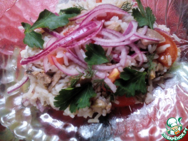 Рис смешать с помидорами, луком, печенью трески (поломанной на кусочки), посолить, поперчить, украсить листиками петрушки, заправить маслом из банки от печени трески.