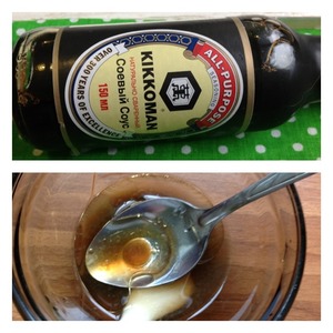 В чашке сделаем соус: нальем соевый соус, масло, сок половины лимона и мед. Тщательно перемешиваем и заправляем салат.