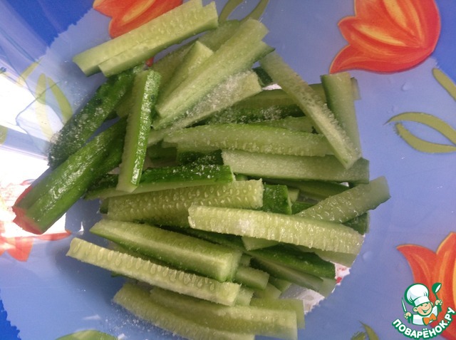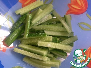 Огурцы нарезать брусочками, подсолить