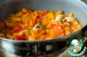 Нарезать небольшими кусочками тыкву, грибы и перец чили.