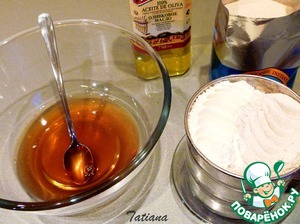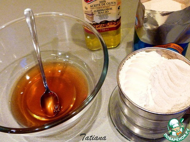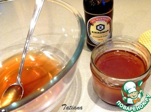 В замесочную миску влейте соевый соус, добавьте мед и теплую (50*С) воду (170 мл), размешайте до растворения меда.