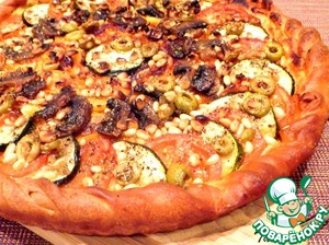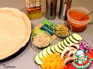 Форму смажьте маслом, переложите в нее тесто, сбрызните оливковым маслом, распределите остывший соус, разложите поверх соуса нарезанные овощи, сверху посолите, поперчите, присыпьте сухим орегано, бортик теста "закрутите" к центру, сбрызните оливковым маслом. -