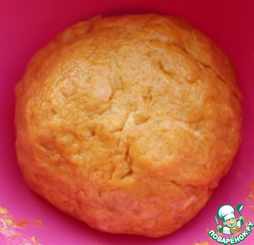 Замесить тесто. Для этого сначала развести 1 ст. л. томатной пасты в полстакана воды, добавить немного соли. Муку просеять, добавить отруби, разрыхлитель и куркуму, перемешать. В муку небольшими порциями ввести сначала воду с томатной пастой, затем растительное масло. Тщательно перемешать и вымесить тесто. Накрыть и дать полежать в течение получаса-часа.