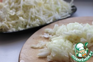 Пока тесто отдыхает, займемся начинкой. Репчатый лук почистить и мелко нарезать. Пекинскую капусту мелко нашинковать.