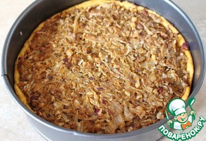 Тесто раскатать и перенести в смазанную растительным маслом форму (лучше всего разъемную), сделать бортики. Выложить начинку и хорошо утрамбовать. Выпекать в предварительно разогретой при 180 градусах духовке 30 минут. После 20 минут готовки пирог лучше всего прикрыть фольгой.