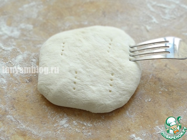 1/8 часть теста раскатать в лепешку, на середину выложить начинку. -
