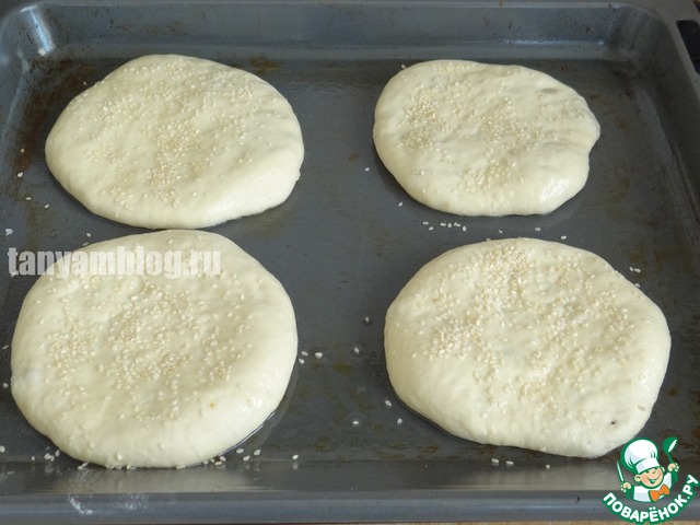 Смазать лепешки растительным маслом, посыпать кунжутом. -