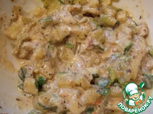 В миску положить муку, добавить специи и перемешать. Добавить соевый соус, воды до состояния густой сметаны. Добавить 1 ч. л. заливки в кабачковую смесь.