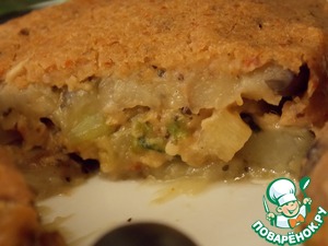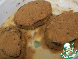 В смазанную маслом форму положить 3 ломтика баклажанов. На них кладем кабачковую начинку и закрываем баклажанами. Сверху смазываем смесью овсяной муки и специй.