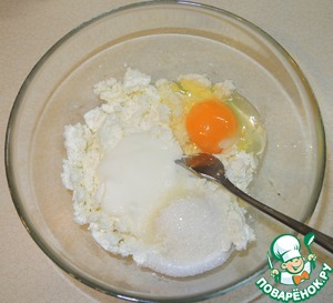 В глубокой миске размять творог с йогуртом, добавить яйцо, соль, сахар.