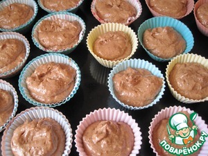 Смешаем сухие и жидкие ингредиенты до однородности (долго перемешивать не нужно). Тесто получится гуще, чем для бисквита-оно не стекает с ложки, а спадает с неё. Заполним тестом формочки для кексов (на 2/3 объёма-тесто сильно поднимается в процессе выпечки). Выпекаем в разогретой духовке 25-30 минут или до сухой шпажки. Дадим полностью остыть.
