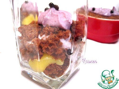 Удалённые серединки я измельчила в крошку и приготовила ещё один десерт-трайфл в стаканах. Для этого я слоями выложила бисквитные крошки, два вида крема и немного взбитых сливок.