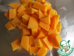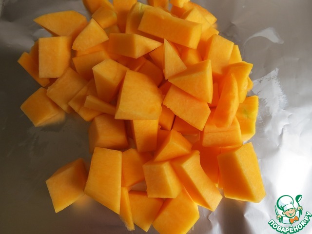 Порезать кубиками тыкву, завернуть в фольгу. отправить в духовку 220" на 40 минут.