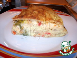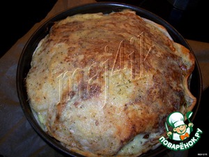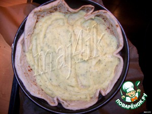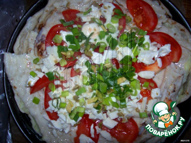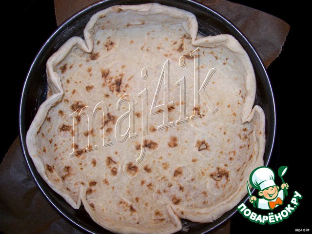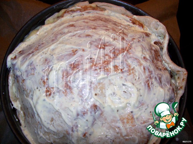 Свеpху положить лаваш и промазать кефиром (у меня лаваш шире формы, поэтому я вырезала подходящий круг, а лишние кусочки положила сверху)