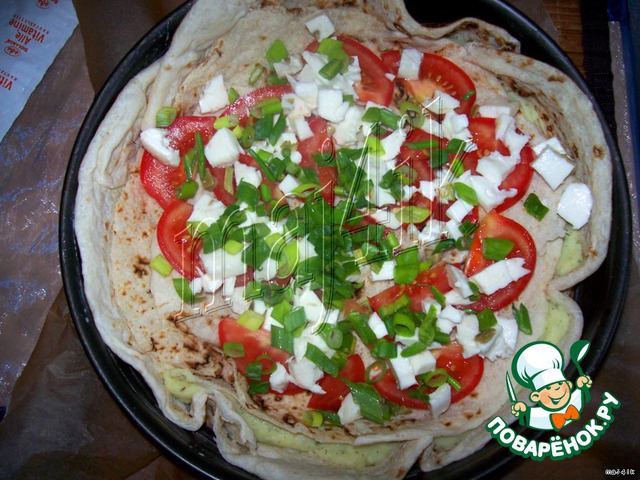 Листом лаваша накрыть сверху и "заправить" его в выступающие бортики нижнего лаваша.
