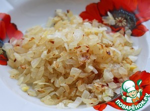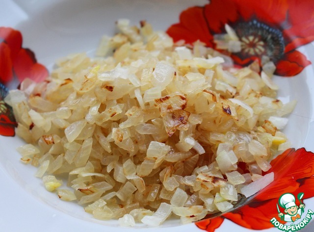 • Лук почистить, мелко нарезать и обжарить на растительном масле до золотистого цвета.