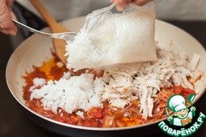 А вот и рис поспел, надрезаем пакетик и высыпаем его в сковороду.