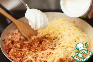 Туда же отправляются тертый сыр и сметана. Перемешиваем, пробуем на соль, перец и снимаем с огня.