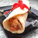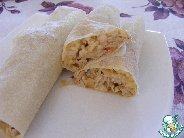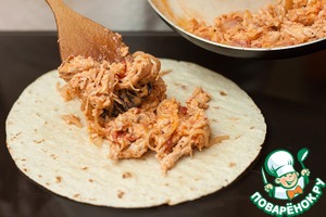На лепешку выкладываем начинку и сворачиваем буррито.