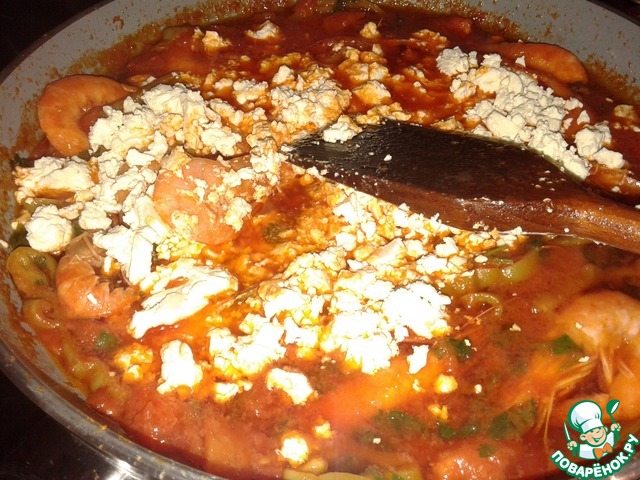 Руками раскрошить фету или нарезать кубиками. Оставляем провариться 1-2 минуты и снимаем с огня прежде, чем сыр начнет расплавляться. Все! Вкуснейшее блюдо готово!!!