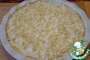 Выложить тесто в подготовленную форму и посыпать порезанным миндалем.