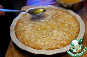 Готовый пирог извлечь из духовки, в несколько приемов полить пирог сиропом, каждый раз давая ему полностью впитаться.