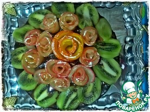 Так же мы поступаем и с апельсиновыми дольками. Я пожалела, что сделала только одну такую розочку, думаю будет красивее если их будем три))) Сверху фрукты посыпать сахарной пудрой. -