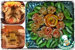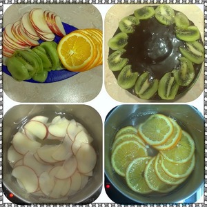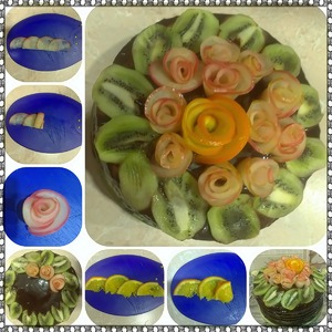 Подготовим фрукты. Яблоко разрезать, убрать сердцевину и порезать очень очень тоненькими дольками (там как получится у вас) примерно 1-2мм. Апельсин так же режем дольками около 1-2мм. На картинке я порезала кружочками, потому что розочка должна была оформляться из них, но у меня в итоге не получились и я сделала такими же дольками как яблоки (попробуйте, может у вас получится из кружочков). Киви режем вдоль, это наши листочки. Их мы сразу выкладываем на края тортика.