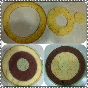 Теперь применение нашего креативчика))) В каждом испеченном коржике мы вырезаем кружочки разного диаметра (я использовала крышки) и складываем друг в друга как на картинке. У вас получится два варианта складывания: коричневый (большой кружок)+белый (по серединке)+коричневый (центр) и белый (большой кружок)+коричневый (по серединке)+белый (центр). То есть в итоге шахматка))