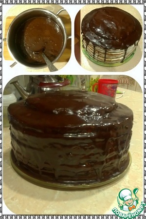 Когда торт застынет, достаем его и обмазываем глазурью сверху и по бокам. Я использовала силиконовую кисточку для обмазки боков, так мне показалось удобнее. Вот такой тортик получился без украшения. Ставим его опять в холод чтоб глазурь застыла. (Я торт делала вечером, чтоб дать тортику хорошенько пропитаться и застыть, а уже перед самим торжеством я готовила украшение). -
