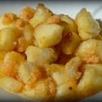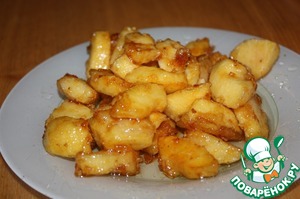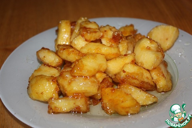 Слить из сковороды большую часть масла, убавить огонь, высыпать в сковороду сахар, нагреть до полного растапливания. Яблоки быстро обжарить в карамели.