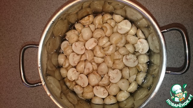 Маленькие шампиньоны моем, режим пополам. Заливаем небольшим количеством воды, в которую добавляем уксус, сахар и соль (по вкусу должно получиться кисло-сладкий маринад). Варим 30 минут.