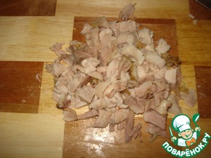 Запечённый окорочок очистить от кожицы и нарезать кубиками.