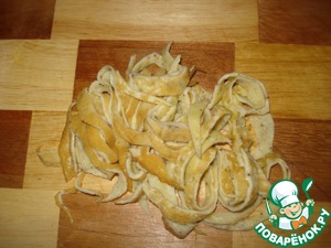 Яйца смешать с 2 ч. л. крахмала, в эту смесь добавить молотый черный перец и пожарить блинчики. После того как блинчики остынут, нарезать их в виде лапши.