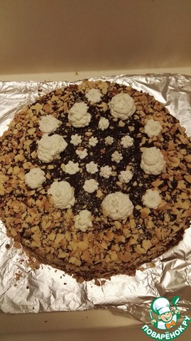 Украшаем верх и бока торта измельченными кусочками теста, ставим на ночь в холодильник.