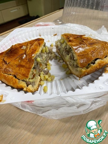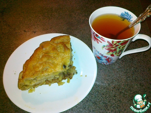 Замесить тесто из всех ингредиентов, дать постоять 20-30 минут, чтобы стало эластичным. Тем временем порезать мясо лук и картошку, добавить лавровый лист, соль перец и перемешать.
