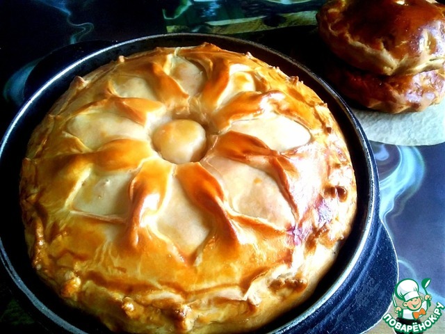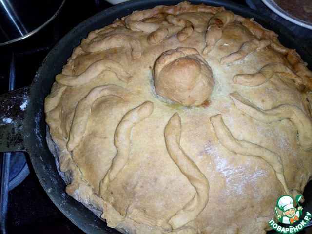 Раскатать в лист вторую часть теста, накрыть пирог, срезать излишки. Края защипать. В центре сделать отверстие диаметром 4-6 см. Из остатков теста сделать крышечку и накрыть отверстие. Остатками теста можно также украсить пирог.