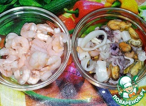 - Морепродукты (креветки - 200 г, кольца и щупальца кальмаров, мясо мидий - 250 г) — 450 г