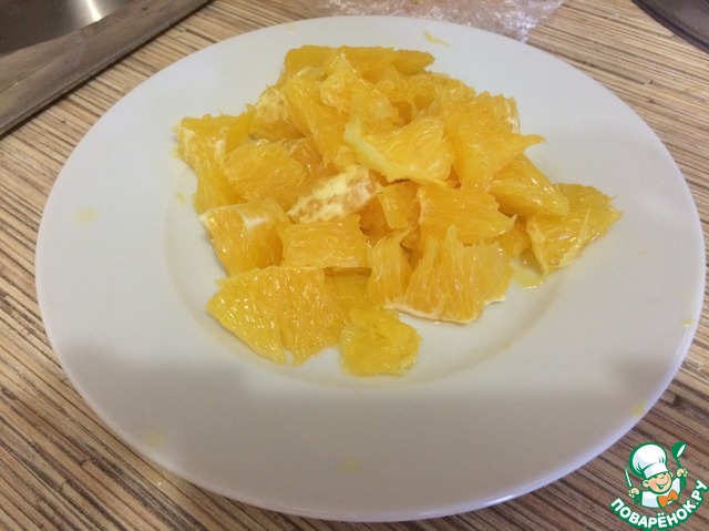 • Апельсин чистим, убираем пленку, режем крупными кусочками