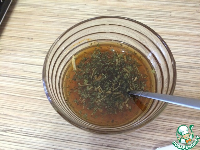 • И делаем соус: растительное масло смешиваем с чесноком, паприкой, мелко нарезанной кинзой и укропом. У меня в этот раз не было свежей зелени, пришлось использовать сушеную