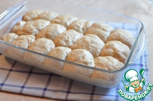(Если нет ХП, замесить тесто, дать ему подняться в теплом месте, обмять, сформировать булочки, выложить в форму и дать им еще раз подняться)