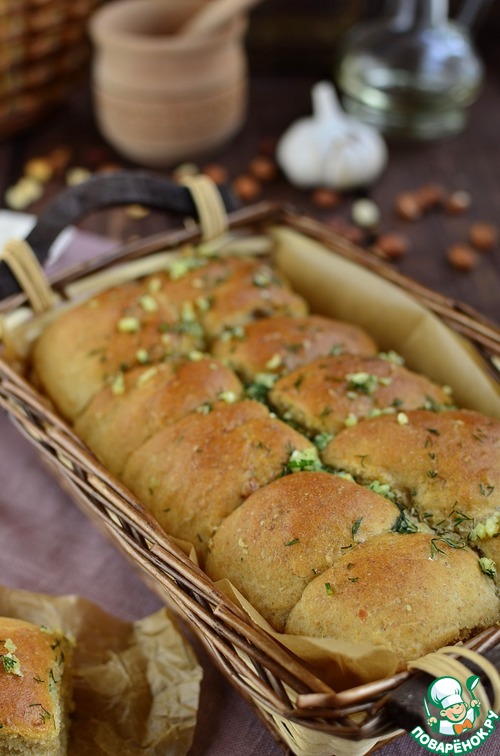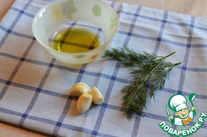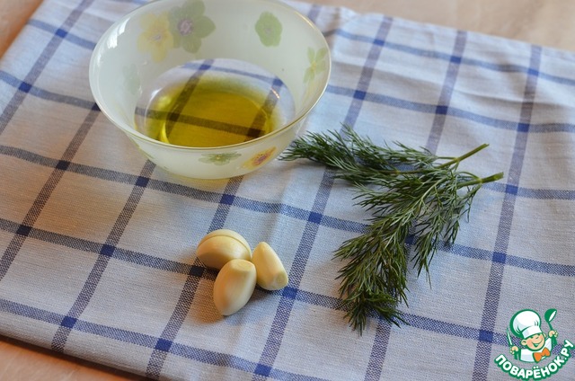Пока булочки выпекаются, почистить чеснок, порубить укроп. В оливковое масло выдавить чеснок, выложить укроп. Перемешать. Пусть масло пропитается чесночным ароматом. Этим маслом мы будем обмазывать булочки сверху.
