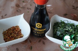 Подготовить соевый соус Киккоман, зелень и специи. У меня смесь специй довольно острая, но Вы возьмите по своему вкусу.