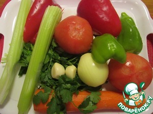 Очистить лук, морковь и чеснок. У перца удалить семена и перегородки. Залить помидоры кипятком на две минуты, затем обдать холодной водой и снять кожицу. Сельдерей помыть. Нарезать все овощи кубиками, чеснок мелко порубить.