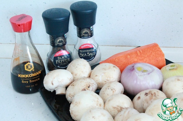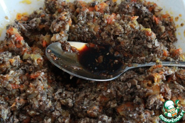 Используем для заправки нашей грибной икры соевый соус Kikkoman. Грибы и соевый соус прекрасно сочетаются.