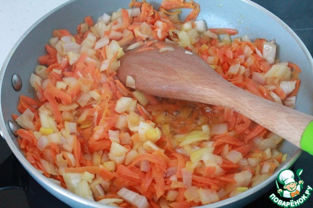 Пока наши грибочки запекаются, обжариваем на растительном масле до готовности предварительно нарезанный лук и натертую на крупной терке морковь.