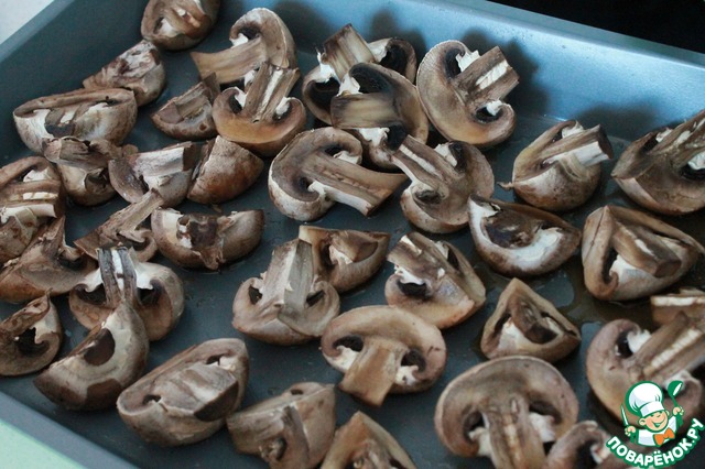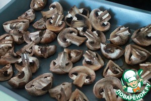 Шампиньоны разрезаем пополам, крупные на 4 части. Выкладываем на слегка смазанный растительным маслом противень и отправляем в разогретую до 150*яс духовку на 25 - 30 минут.