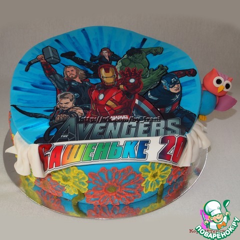 В этом торте мне нужно было объединить милых совушек, цветочки и мстителей.