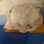 Сначала горячий тост, сверху свежеобжаренный бекон, за ним пашот, и ложку тёплого и соуса.