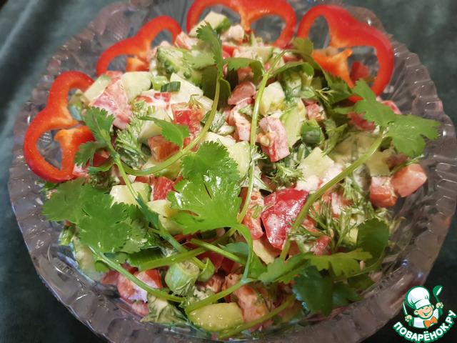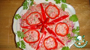 Уложите в салатницу. Украсить салат можно красным болгарским перцем, нарезанным кольцами. ПРИЯТНОГО АППЕТИТА!!!